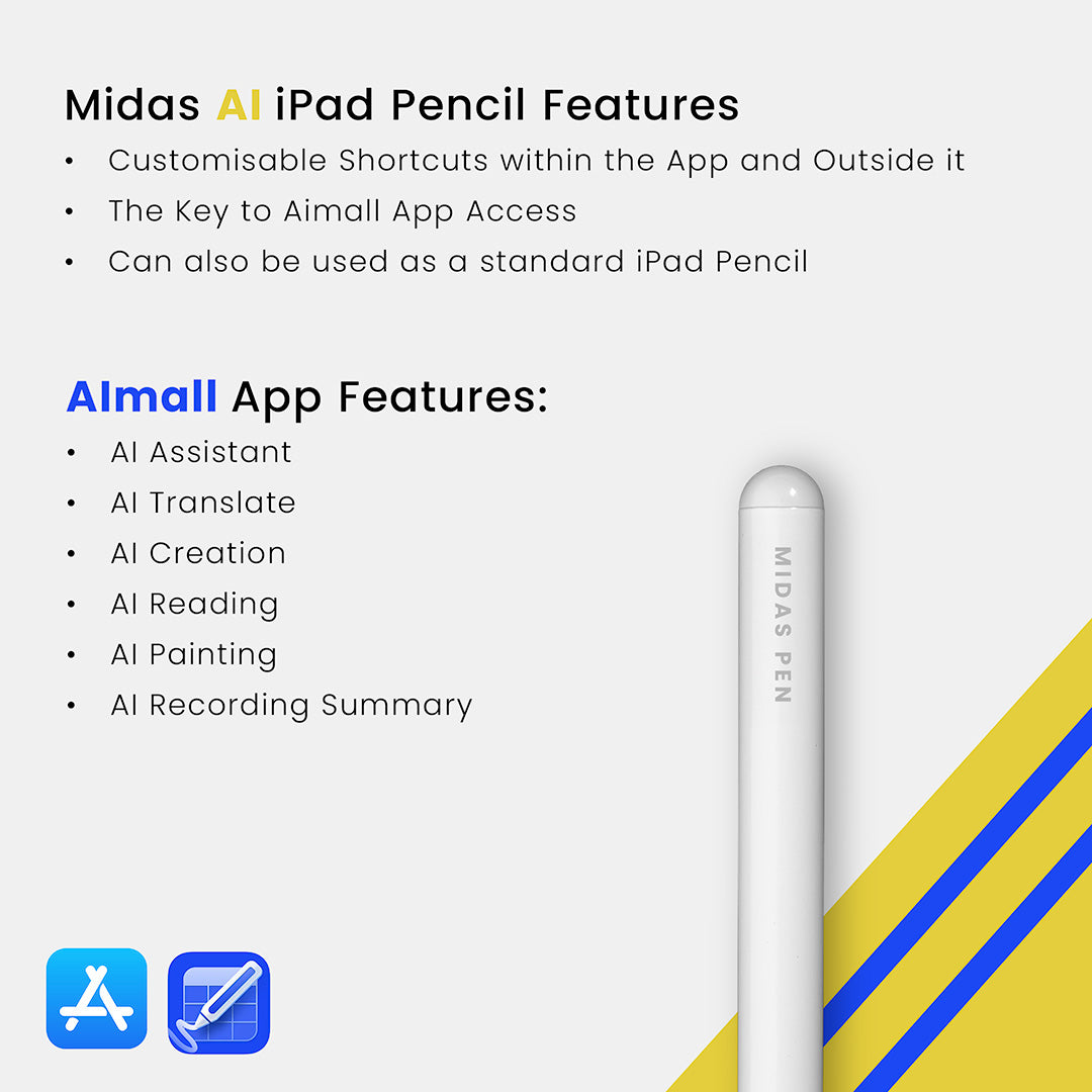 The Midas AI iPad Pencil is the world’s first AI-powered stylus, designed specifically for use with the Aimall app, developed by world class Chinese engineers. It delivers the ultimate AI experience, offering a full year of free access to the app, customizable shortcut functions, and all the capabilities of a standard iPad pencil.