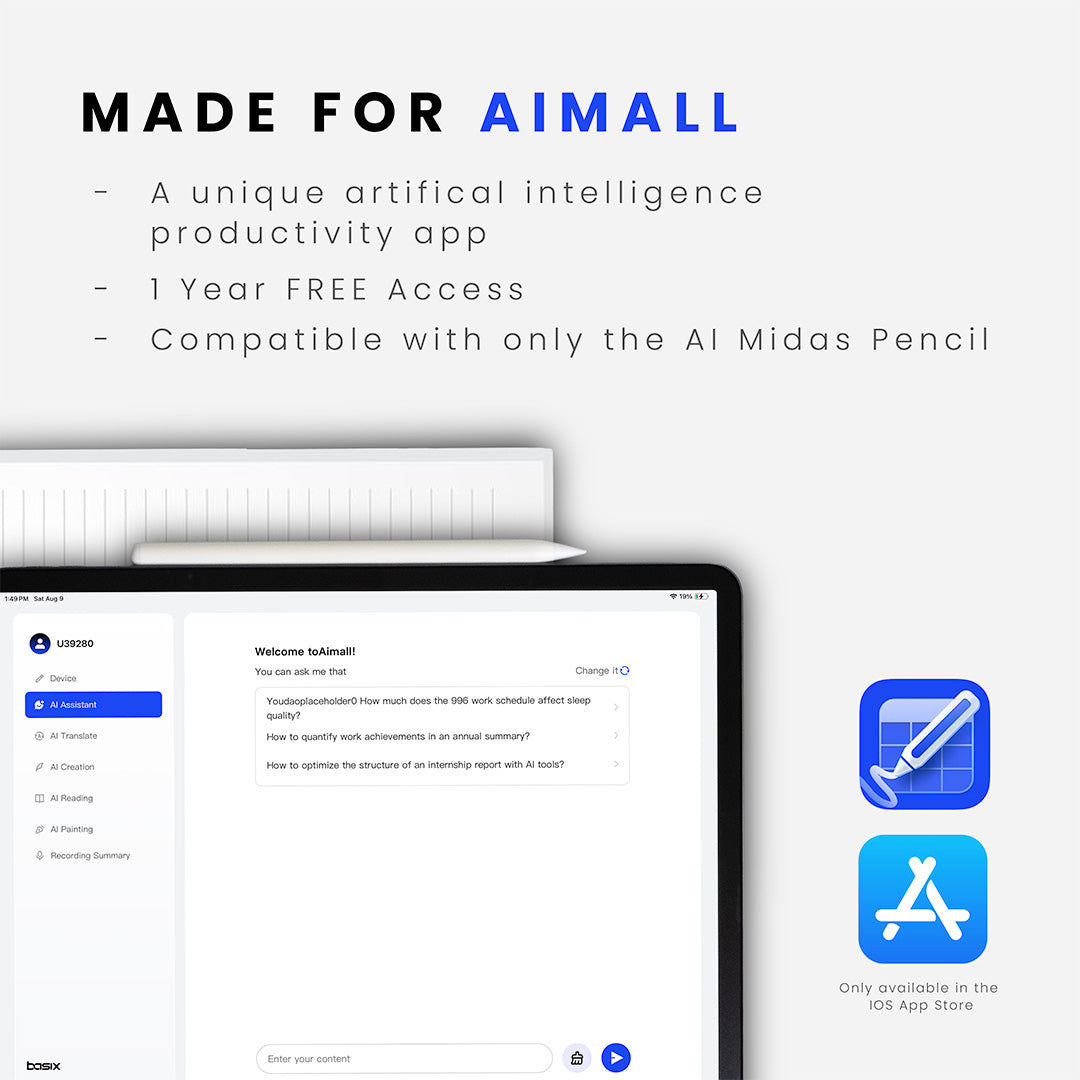 Please note the Aimall App cannot be used without the Midas AI iPad Pencil. To download the app, search "Aimall" on the App Store.